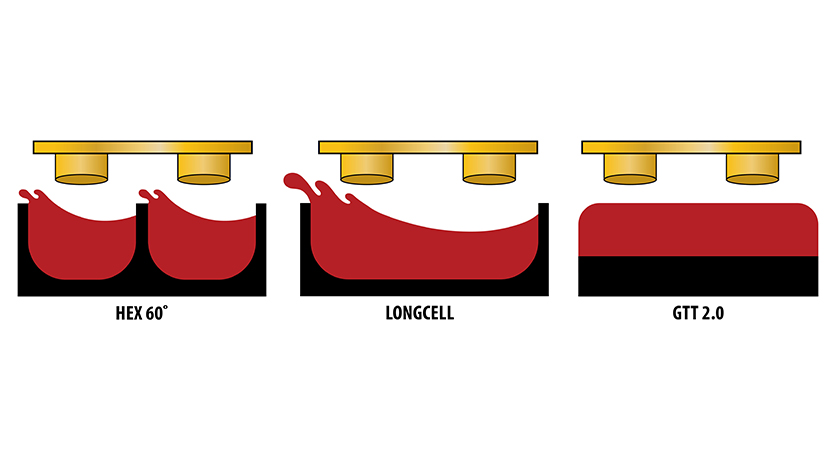 The breakthrough that solved these problems, Harvey says, is open-channel engravings. He states, “The real leap forward came with engineered open-channel engravings such as GTT. Instead of trapping ink in closed hexagonal cells, GTT channels are designed to relieve pressure under the doctor blade and stop hydraulic build-up at the source; improve flow so even high-viscosity UV inks replenish and release consistently; and balance transfer by optimizing flow resistance and release for smooth, predictable ink laydown.