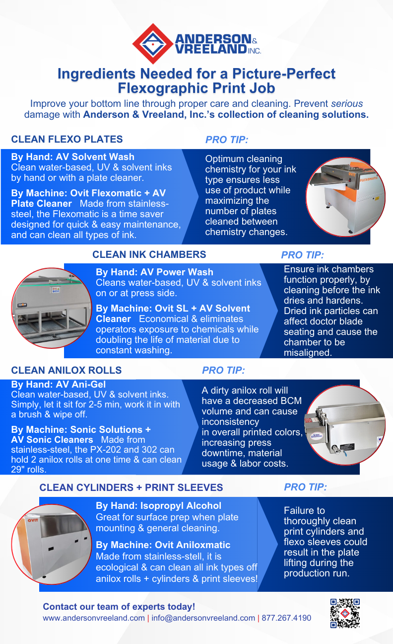 The importance of proper care and cleaning cannot be emphasized enough. Putting off cleaning for even a brief time can cause damage as ink dries quickly. As the ink hardens, it becomes difficult, or sometimes impossible, to remove later. Whether you are looking for a hand or machine solution, A&V has an extensive portfolio of world-class products to keep your plates, ink chambers, anilox rolls, print sleeves and cylinders free from defects!