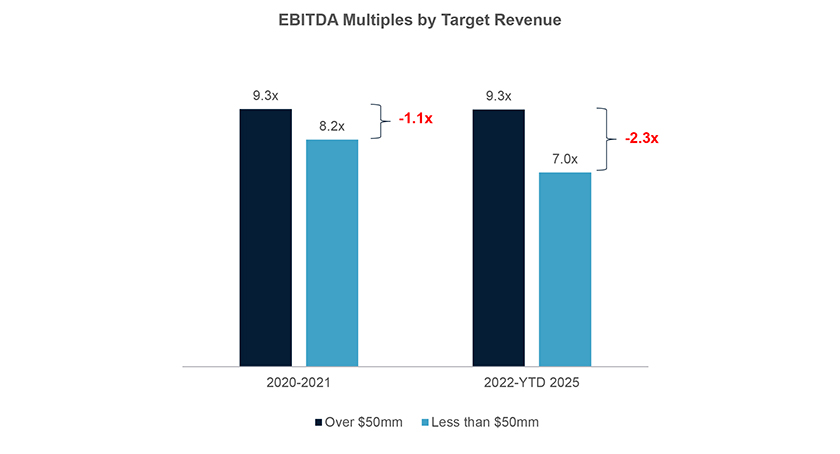 Pricing followed these volume trends, with the average multiple of 9.25x for 2020-2021 decreasing by two turns of EBITDA to an average of 7.2x for 2022-2024. The disparity is heightened when considering the premium paid for larger buyout transactions versus smaller transactions, the latter of which constitutes the bulk of add-ons and private transactions in the label industry. While multiples among larger transactions generally held to the 2020-21 pricing, the discount to smaller transactions increased to over 2x during this period.