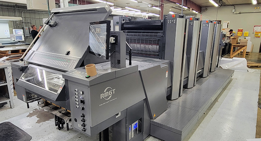 On the offset side, Graphics Universal has relied on Komori. Currently, the company boasts a 5-color Komori and a 4-color Ryobi that can run four colors straight or two-over-two perfecting.